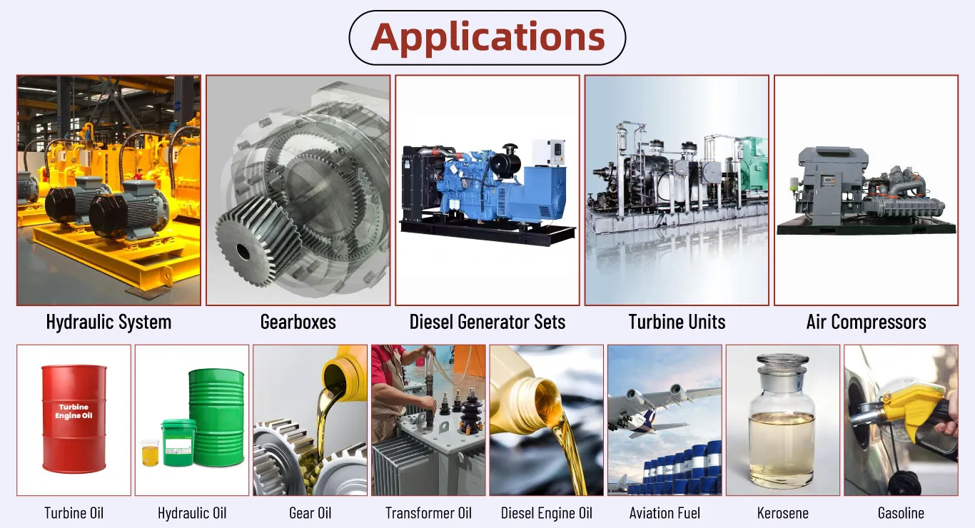 Its application scope includes hydraulic systems, gearbox assemblies, diesel generator sets, turbine units, and air compressors. Applicable fluids include hydraulic oil, gear oil, transformer oil, turbine oil, diesel engine oil, aviation fuel, kerosene, and gasoline.
